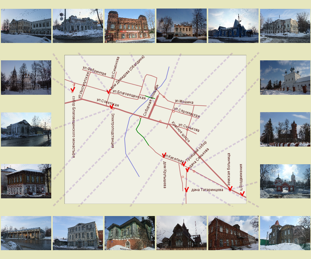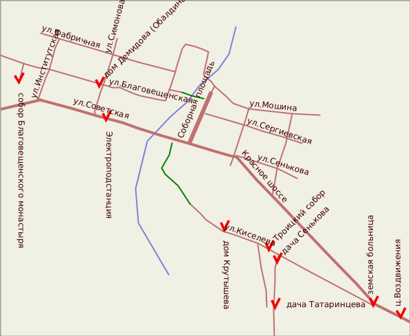 Собственно дорога до Вязников не вызывает вопросов, однако об особенностях ориентирования в самом городе стоит сказать несколько слов. Прямых дорог "с горы" вниз и обратно зачастую нет, например, спуститься прямо от гостиницы к Ярцевской фабрике на автомобиле невозможно. Маршрут от центра прямо на Минину гору и улицу Киселева лучше планировать как пешеходный (отмечен на схеме зеленым цветом). Если на автомобиле - то проехать в сторону Нижнего по Советской и Красному шоссе, и, когда последнее взбертся на гору, повернуть резко направо-назад на улицу Киселева (у ворот земской больницы).