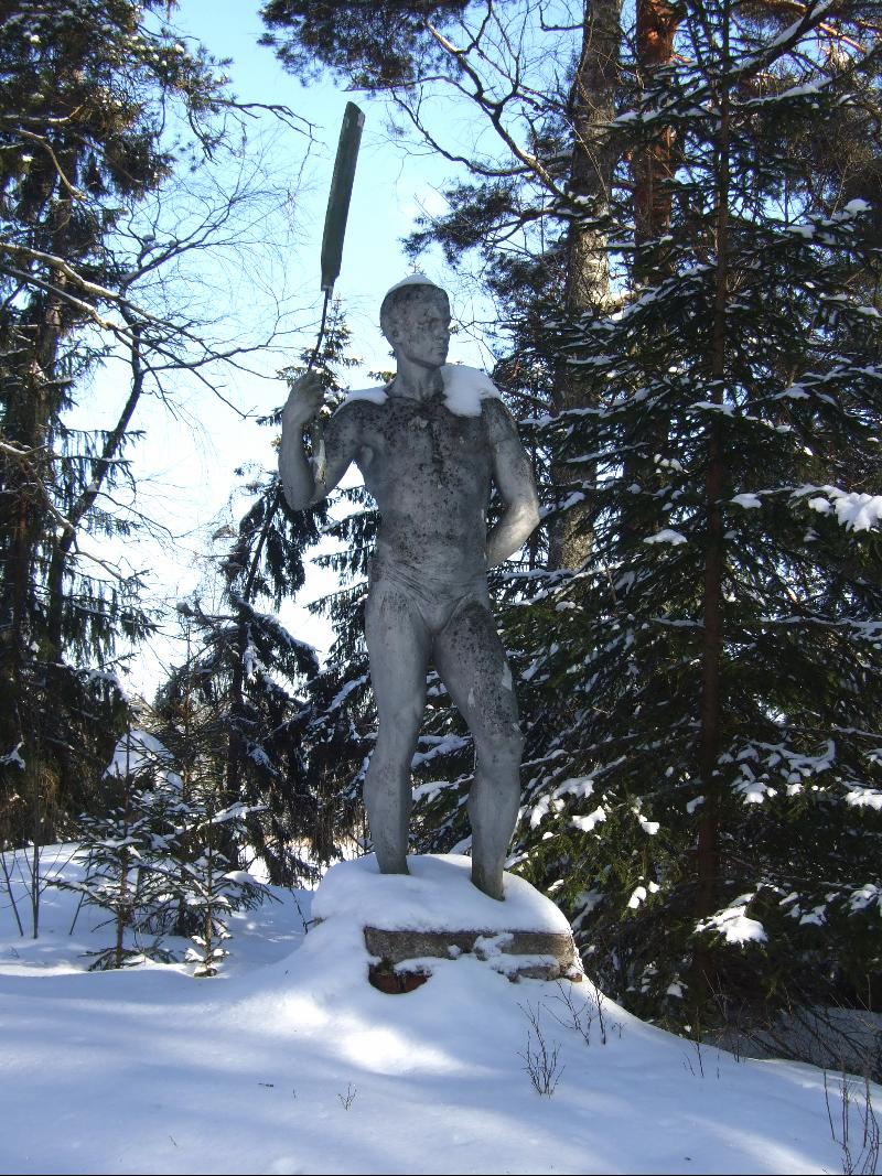 Возле южного фасада, ближе к озеру, гордо высится замечательный памятник советской эпохе, так знакомый нам по загородным домам отдыха и пионерлагерям, юноша с веслом. Перед главным входом есть еще и девушка, но без весла.