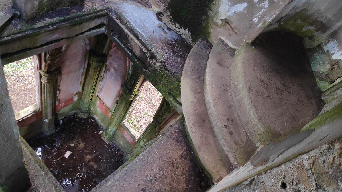 Часовня состоит из двух пересекающихся объёмов: главного, первый этаж которого в плане образует квадрат, и высокой боковой круглой башни. Внутри последней размещается винтовая лестница. На фото виден выход с лестницы, то есть из круглой башни, на уровень второго этажа главного объёма. В квадратном проёме между вторым и первым этажом когда-то был прозрачный пол из голубого стекла. Теперь это просто провал, так что будьте осторожны...