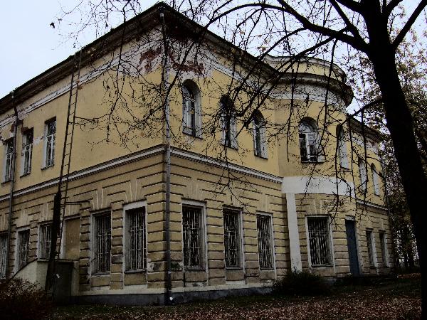 Высокие окна первого этажа оформлены плоскими нишами. В сторону парка полукругом выступает большой парадный зал, за ним - миниатюрный проходной аванзал и вестюбюль.