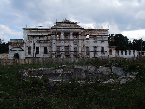 Парадный фасад дворца с четырехколонным дорическим портиком строг и немногословен. Не так давно он оделся в строительные леса и это вселяет надежды. Новые владельцы по-своему ухаживают за усадьбой. Лужок перед главным домом выкошен, так что видны остатки фонтана.