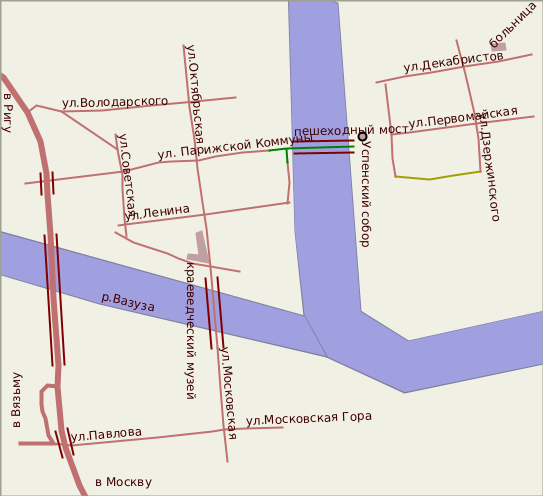 Проезд -по шоссе Москва-Рига. К древнему городищу и Успенскому собору на автомобиле можно попасть только переехав Волгу по по шоссе на Старицу (поворот на Старицу за пределами нашей схемы, дальше по шоссе в строну Риги).Однако лучше оставить автомобиль в современном центре города, например, около краеведческого музея,и прогуляться на левый берег по подвесному пешеходному мосту.